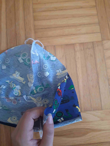Legt nun die beiden so vorbereiteten Mützenteile rechts auf rechts aufeinander und näht die beiden Teile an der Rundung zusammen. Das Grundgerüst steht!