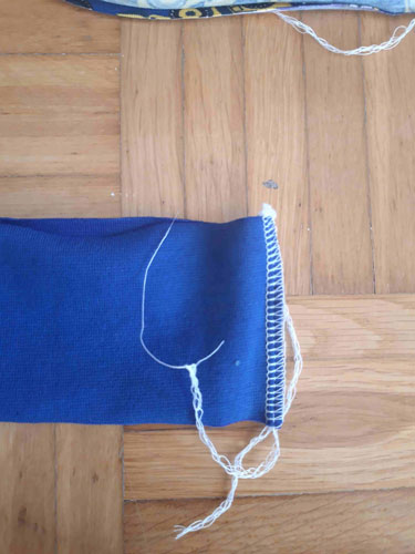 Hier wird mit einer Overlook-Maschine genäht. Wenn ihr keine habt, halb so schlimm! Stellt einfach einen dehnbaren Stich in eurer Haushaltsnähmaschine ein.