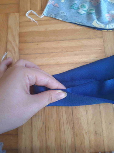 Faltet das Bündchen nun einmal mittig der Breite nach rechts auf rechts und näht es an der kurzen Seite zusammen. Wendet es dann wieder auf rechts und klappt es mittig der Länge nach zusammen, sodass die eben entstandene Naht innen liegt.