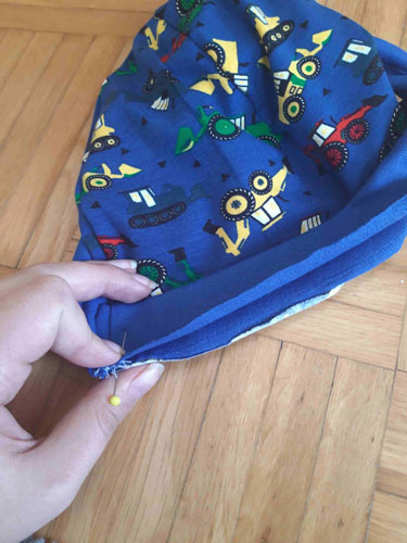 Steckt es anschließend rechts auf rechts an der Mütze fest.Am schönsten ist es, wenn sich die Naht des Bündchens an der hinteren Mitte der Mütze befindet.