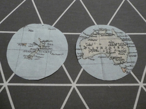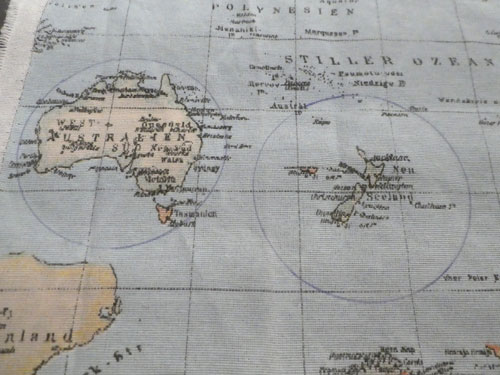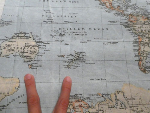 Bevor ihr mit dem Zuschneiden beginnt, legt den Weltkarten-Stoff zurecht und sucht euch ein Land nach eurem Geschmack oder euren Vorliebe aus. Ich habe mich für Australien und Neuseeland entschieden.