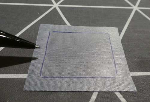 Legt nun eure Folie mittig auf die linke Seite (nicht so schöne Seite) des blauen Kunstleder-Rechtecks und zeichnet einmal um das Rechteck herum.