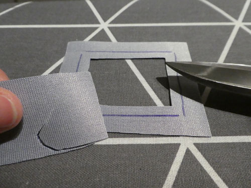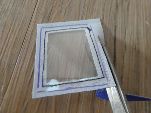 Anschließend schneidet ihr das Rechteck aus. Achtet darauf, dass ihr NICHT ganz bis zum Strich schneidet, sondern einen Abstand von ca. 4 mm lasst, damit ihr die Folie später an euren gerade erstellten "Rahmen" nähen könnt.