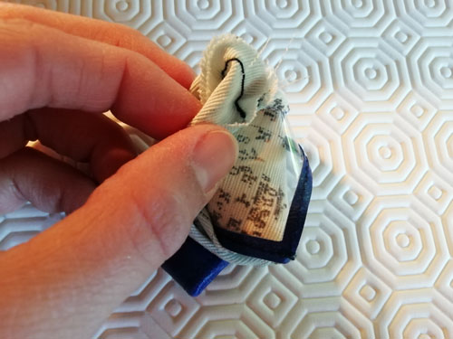 Legt nun einen Kreis gerade vor euch. Faltet den Streifen einmal in der Mitte und näht ihn mittig an der oberen Kante einmal fest, sodass er nicht mehr verrutschen kann.