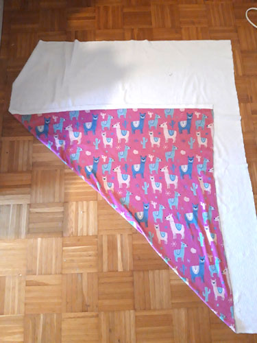Ihr könnt einfach eine Ecke des Stoffes zum unteren Ende legen, sodass ein Quadrat entsteht und dieses dann zuschneiden.