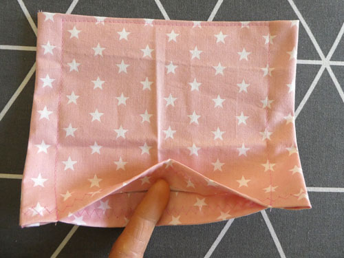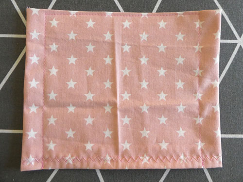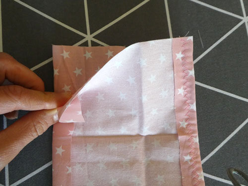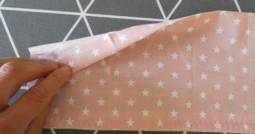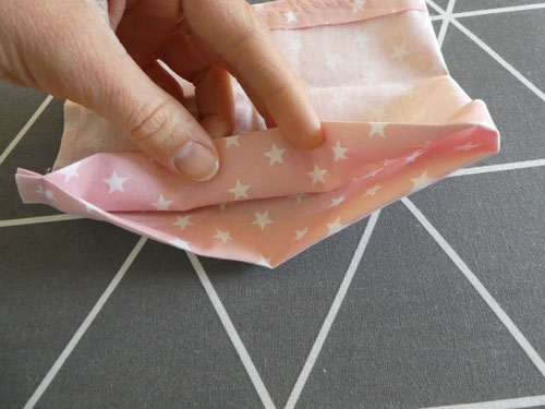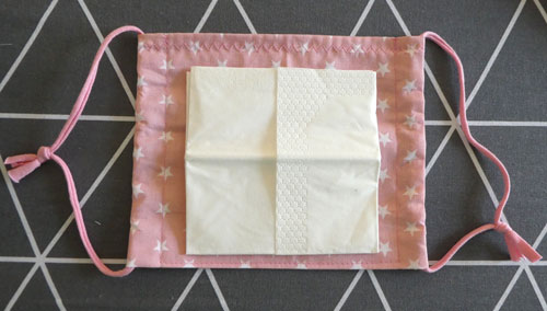 Legt den Mundschutz nun so hin, dass die offene Zickzack-Naht nach oben zeigt. Hier könnt ihr, wenn gewünscht, ein Papiertaschentuch hineinstecken.