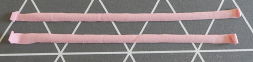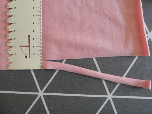 Schneidet nun aus dem Jerseystoff zwei ca. 1cm breite und 25cm lange Streifen. Schneidet hierbei der Länge nach am Fadenlauf entlang.