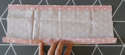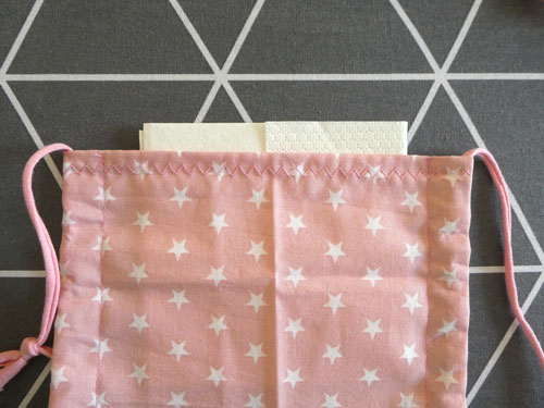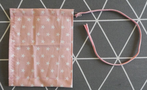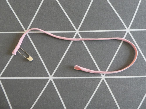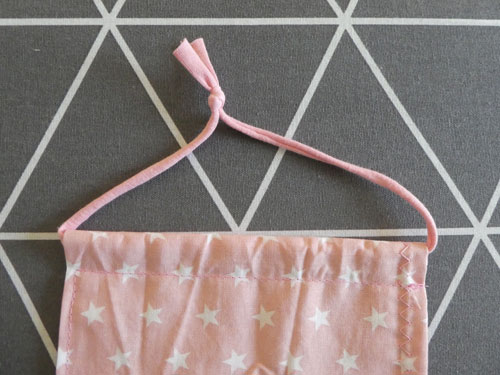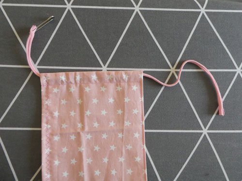 Fädelt die Kordel mit Hilfe einer Sicherheitsnadel durch eine Seitentunnel eures gerade genähten Rechtecks.