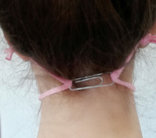 Wenn iht die Kordel hinter den Ohren nicht angenehm findet, könnt ihr auch mit einer Büroklammer die beiden Schlaufen hinter dem Kopf zusammen halten.