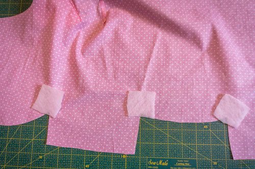 Bügelt nun die Vlieseline-Quadrate auf die auf dem Foto ersichtlichen Stellen. Pro Schnittteil benötigt ihr drei Quadrate.