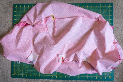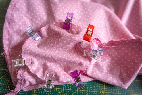 Danach steckt ihr erst das erste Seitenteil sorgfältig rechts auf rechts fest und näht es an. Als Hilfe dienen euch hier die markierten Knipse, die jeweils bei beiden Teilen aufeinander treffen sollen.