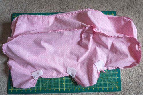 An dieses Teil steckt ihr nun die vier Schnittteile 4 für die Beine rechts auf rechts fest und näht sie an. Die Zipfelchen von den Beinenden standen bei mir teilweise etwas über, aber das sieht man nachher nicht mehr.