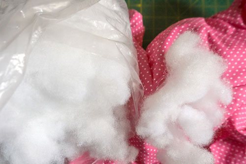 Jetzt ist Raubtierfütterung! Ihr müsst euer Nashorn nun mit unglaublich viel Füllwatte durch die Wendeöffnung füttern. Nicht wundern, Nashörner sind gefräßig und es passt wirklich sehr viel rein. 1,5-2 kg Füllwatte benötigt ihr hierfür. Es kann ruhig schön prall und fest werden.