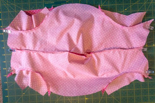 Nun näht ihr das so vorbereitete Teil mit den kurzen Seiten an die kurzen Enden des Unterteils. Achtet hierbei darauf, dass ihr vorne und hinten nicht verwechselt.