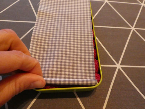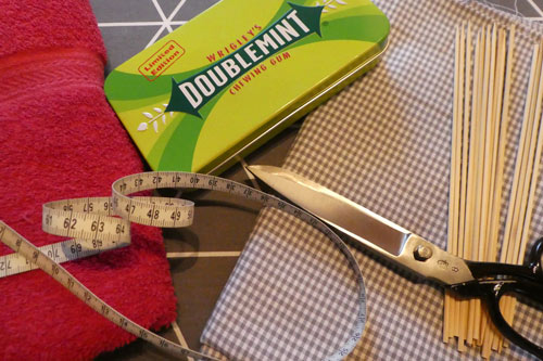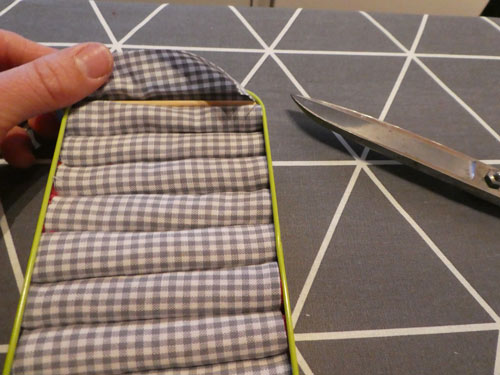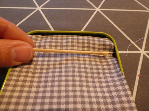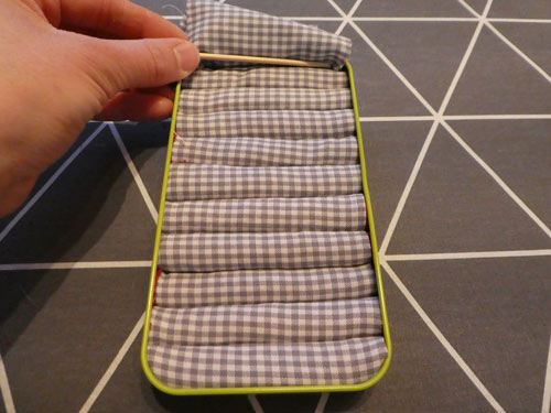 Am Ende schneidet ihr den überstehenden Stoff ab, wickelt ihn um einen Schaschlik-Spieß und drückt ihn in den letzten Spalt (zwischen Handtuchrolle und Dose).