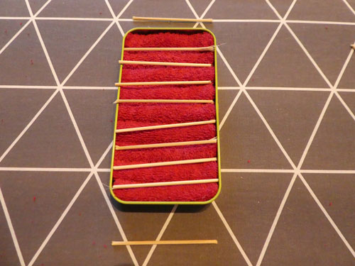 Jetzt werden die Schaschlik-Spieße in Stücke gebrochen, die so lang sind, wie die Dose breit.