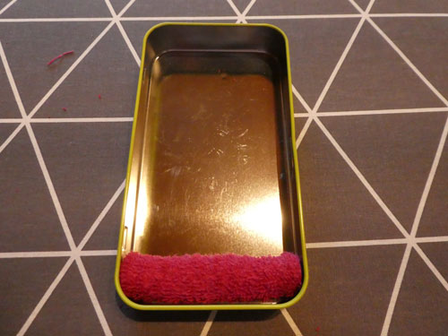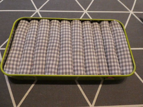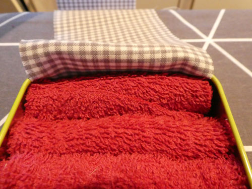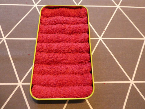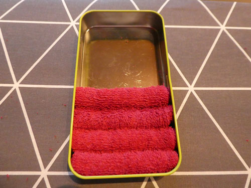 Im Anschluss rollt ihr die Handtuch-Stücke zu Rollen auf und schichtet sie nacheinander in die Dose.