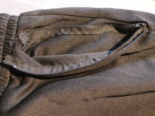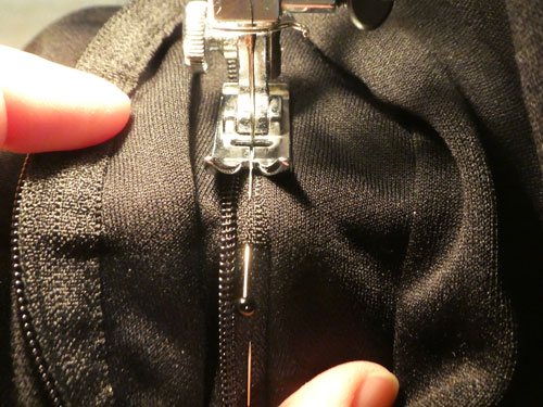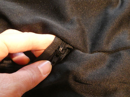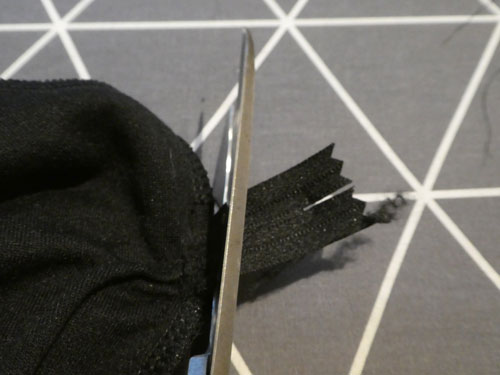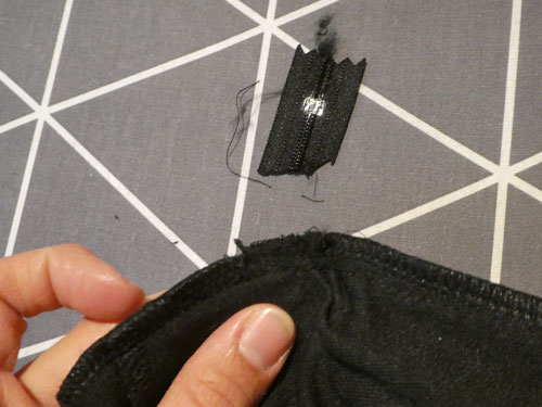 Stecke unten das überstehende Stück deines Reißverschlusses in das Loch. Achte darauf, dass du den Zipper NICHT ins Loch steckst.