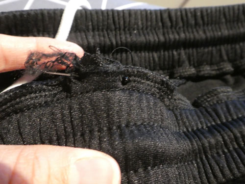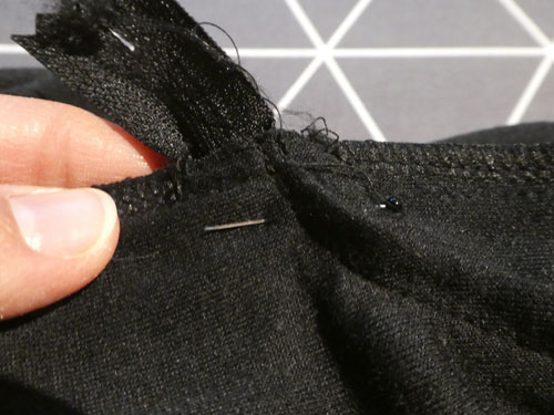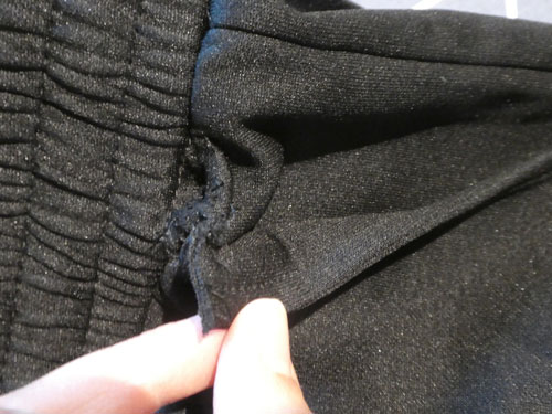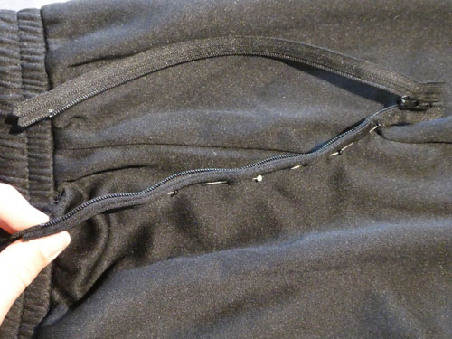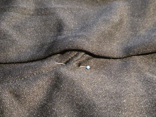 Schiebe nun die beiden Seiten oben und unten in die Löcher die du zu Beginn aufgetrennt hast und stecke das Loch auf der linken Seite (nicht so schöne Innenseite der Jogginghose) mit Stecknadeln zu.