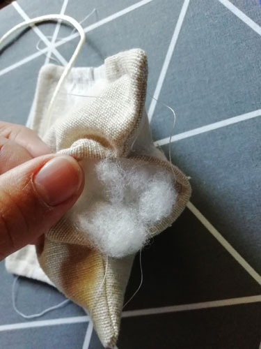 Füllt dann das Kissen mit Füllwatte. Je nach persönlicher Vorliebe kann man es mit mehr oder weniger Watte füllen.
