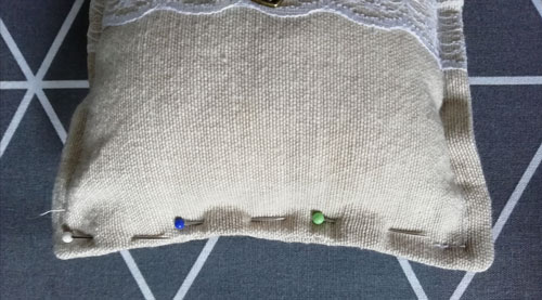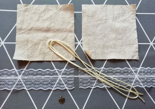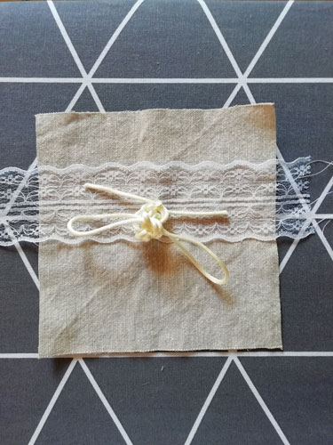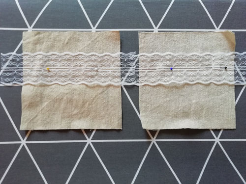 Legt die zwei Quadrate mit der rechten (schönen) Seite nach oben vor euch hin und legt das Spitzenband, waagrecht in die Mitte der beiden Quadrate. Steckt beide Spitzenbänder fest.