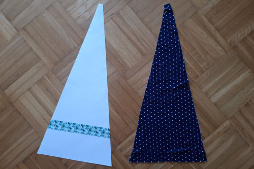 Schneidet diese Vorlage nun zunächst aus Papier aus. Dieses Dreieck legt ihr dann an eure Bruchkante des Stoffes und schneidet es ebenfalls zu. Ihr benötigt zwei Dreiecke aus Stoff. Achtet hierbei auf den Fadenlauf. Die lange Gerade in der Mitte könnt du als Anhaltspunkt nutzen.