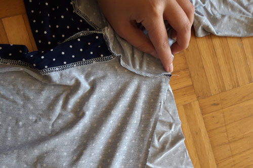 Setzt die Spitze am unteren Armloch an und näht eine Seite fest.