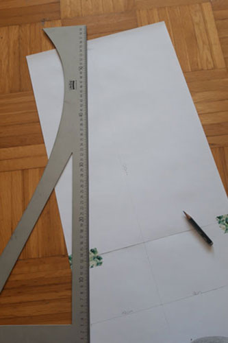 Überlegt euch, wie viel breiter das Shirt sein muss (hier 22 cm pro Seite + 2 cm Nahtzugabe). Zeichnet eine Gerade im rechten Winkel an die lange Linie und messt davon euren Wert / 2 + 1 cm Nahtzugabe an. Bei mir wären das 11 cm + 1 cm Nahtzugabe.