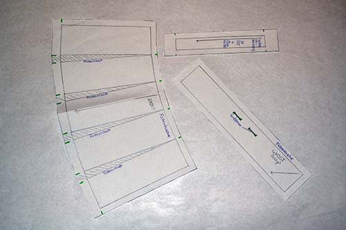 Die einzelnen Abtrennungen werden nun von unten nach oben aufgeschnitten. Achte hierbei darauf, dass oben noch ein Stückchen zusammen bleibt. Das mittlere Feld bleibt das richtungweisende, es bekommt also den Fadenlauf parallel zur langen Seite. Die anderen Teile drehst du so vom Mittelteil weg, dass unten in jedem Zwischenraum ein Abstand von 1,5 cm entsteht. Solltest du größere Falten wollen, drehst du die einzelnen Teile so vom Mittelpunkt weg, dass ein größerer Abstand entsteht. Wenn du die richtigen Abstände eingestellt hast, klebst du das Schnittteil auf ein Blatt Papier. Wie abgebildet, wird die Rundung am Faltenteil ausgezeichnet und Knipse für die Falten eingezeichnet.