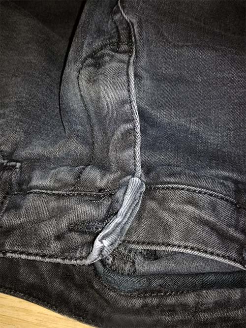 Du musst sehr vorsichtig mit den Belegen umgehen. Eventuell ist es notwendig, die Schrittnaht etwas weiter zu öffnen aber meistens ist der Schlitzbeleg nur an den anderen Beleg geriegelt, das heißt er wurde nur ca. 1 cm angenäht. Die einzelnen Seiten des Reißverschlusses dürfen auf keinen Fall verrutschen. Ansonsten verzieht sich der Stoff beim Schließen des Reißverschlusses.