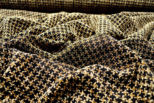 Zu absoluten Top-Preisen können Sie jetzt schon bei uns warme Strickstoffe mit modischen Glitzermustern ergattern! Zum Beispiel Hahnentritt in Gold: