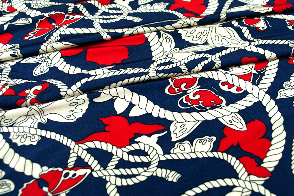 Schmetterlinge, die um Seemannsknoten herumflattern, zieren diesen fließend fallenden Viskose-Jersey. Der weiche und geschmeidige Viskose-Jersey ist äußerst hautsympathisch und dank seines Elasthan-Anteils zudem elastisch.