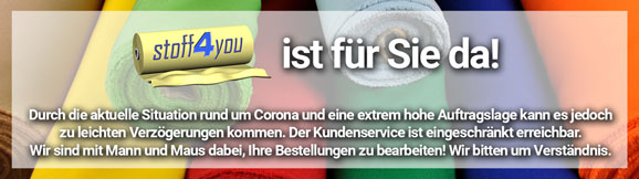 Wir bitten um Verständnis, dass es hierbei auch zu leichten Verzögerungen kommen kann. Doch wir versichern Ihnen, dass wir mit Hochdruck daran arbeiten, dass Sie in dieser schwierigen Zeit Ihre Stoffe schnellstmöglich erhalten und sich schon bald Ihren Nähprojekten widmen können.