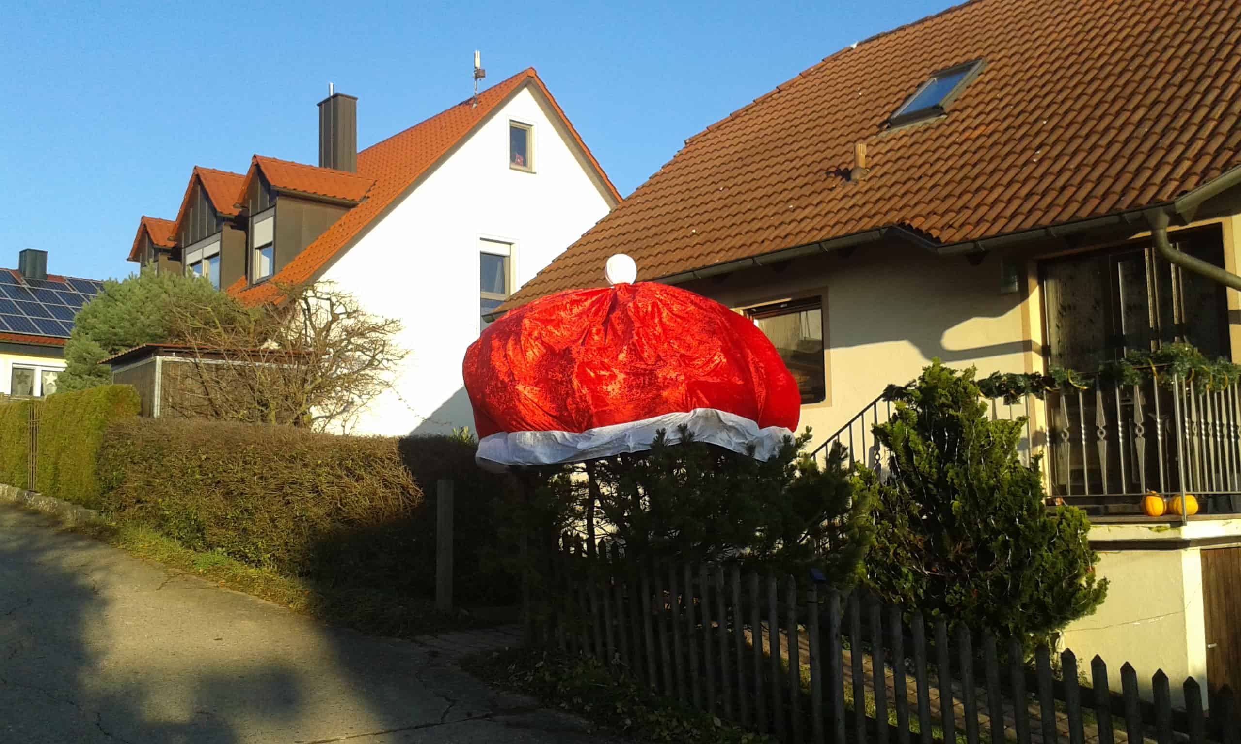 Es weihnachtet sehr im deutschen Lande! Hier ein Beispiel aus dem #stoff4you #Stoffe Blog "Mach mit" Eine riesige Nikolaus-Mütze wurde hier aus 6 m Pannesamt Stoff für den Vorgarten-Baum genäht. Mehr Details sind hier zu sehen:
