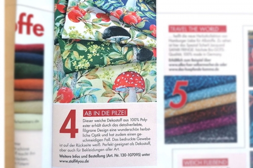 Die Handarbeitszeitschrift "Anna" präsentiert monatlich interessante Beiträge zu DIY-Wohnaccessoires, Deko-Ideen und Bastelarbeiten. Klar, dass da Stoffe von stoff4you nicht fehlen dürfen! Auch in der September-Ausgabe 2022 ist stoff4you vertreten. Diesmal wurden Inspirationen für die herbstliche Nähwerkstatt vorgestellt. Unser herbstlicher Dekostoff "Herbstwald" hat in dieser Rubrik seinen Platz eingenommen. Perfekt für stimmungsvolle Dekorationen, passend zur Jahreszeit.