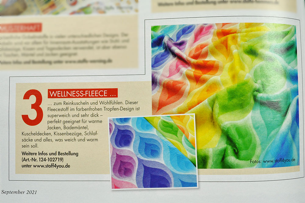 Die Handarbeitszeitschrift "Anna" präsentiert monatlich interessante Beiträge zu DIY-Wohnaccessoires, Deko-Ideen und Bastelarbeiten. Klar, dass da Stoffe von stoff4you nicht fehlen dürfen! Auch in der September-Ausgabe 2021 ist stoff4you vertreten. Diesmal wurden Inspirationen für die herbstliche Nähwerkstatt vorgestellt. Unser flauschig-weicher Wellness-Fleece "Rainbow Drops" hat in dieser Rubrik seinen Platz eingenommen. Wenn es in der Übergangszeit mal kalt wird, hält er als Decke oder gemütliche Homewear herrlich warm, zudem bringt er mit seiner knallbunten Optik Farbe in die oftmals kargen und tristen Herbsttage.