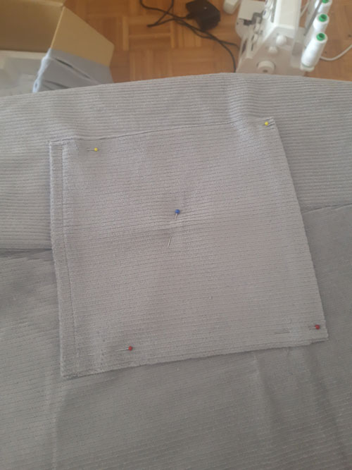 Nun stecke ich die Taschenbeutel rechts auf rechts an das erste Hosenteil, natürlich an die Seitennaht. Achte dabei darauf, dass die Knipse aufeinander liegen. Nähe nun den Beutel bei 1 cm fest. Bügle die Naht auseinander. Wiederhole diesen Vorgang nun an den anderen drei Teilen.