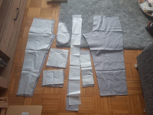 Nimm alle Schnittteile heraus. Die zusätzlichen Schnittteile kannst du der Anleitung nach herausnehmen. Die Maße hierfür findest du auf Seite 37 in der Maßtabelle. Zeichne nun um den Schnitt herum 1 cm Nahtzugabe und schneide ihn anschließend aus.