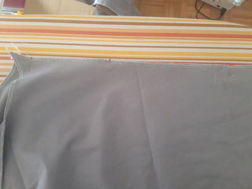 Um es später einfacherer zu haben, bügle ich die Naht auseinander. Falte nun den Bund an der langen Seite, sodass die linke Seite innen liegt, sprich die rechte Seite sollte außen sein. Nun stecke den Bund auf der rechten Seite der Hose fest.