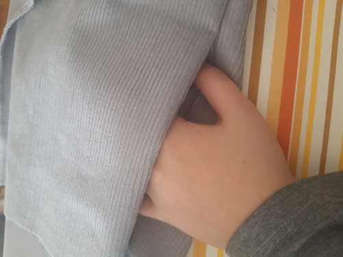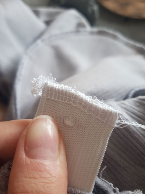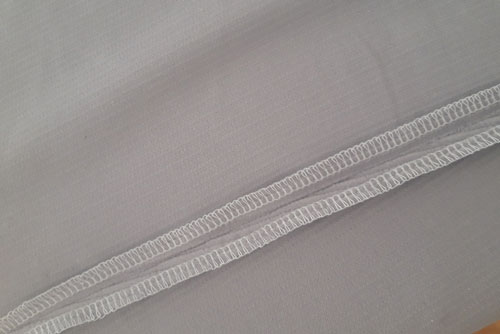 Versäubere die Naht. Ziehe durch das entstandene Loch den Gummi, versäubere ihn und vernähe den Zopf. Zum Schluss schließt du das Loch mit einem Handstich.